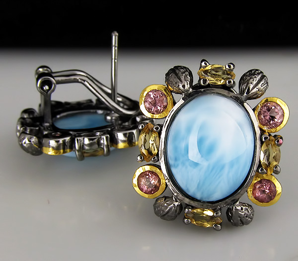 Серьги из черненого стерлингового серебра 925 пробы с ларимарами, сапфирами и цитринами. Вес — 7,5 гр. Размер серег — 18×16 мм. Выборочное золочение.