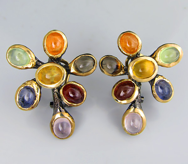 Серьги из черненого стерлингового серебра 925 пробы с розовым кварцем, мозамбикскими и малайа гранатами, иолитами, цитринами, дымчатыми топазами и перидотами. Вес — 25 гр. Размер серег — 35×29 мм. Выборочное золочение.