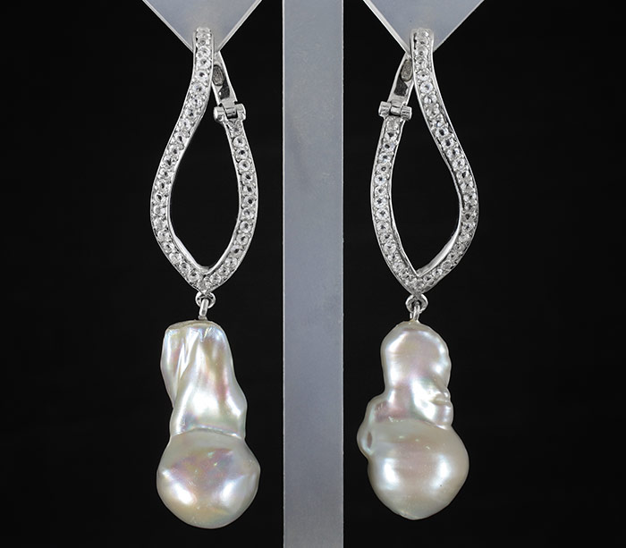 Серьги из стерлингового серебра 925 пробы с пузырчатым жемчугом и бесцветными топазами. Вес — 13,5 гр. Размер серег — 66×14 мм.