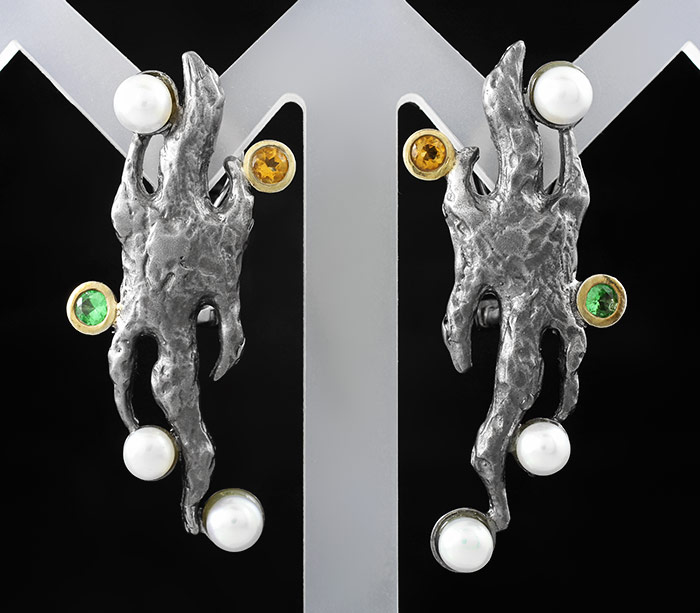 Серьги из черненого стерлингового серебра 925 пробы с жемчугом, цаворитами гранатами и золотистыми сапфирами. Вес — 12,5 гр. Размер серег — 41×17 мм. Выборочное золочение и матирование.