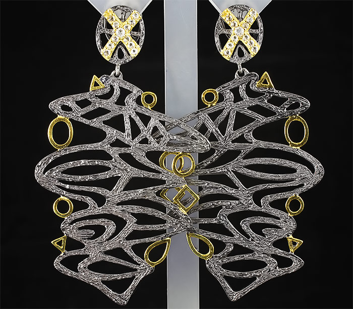 Серьги из черненого стерлингового серебра 925 пробы с бесцветными топазами. Вес — 20,7 гр. Размер серег — 71×42 мм. Выборочное золочение.