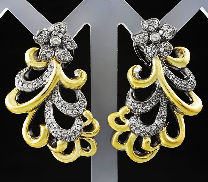 Серьги из черненого стерлингового серебра 925 пробы с бесцветными сапфирами. Вес — 21,4 гр. Размер серег — 41×26 мм. Выборочное золочение.
