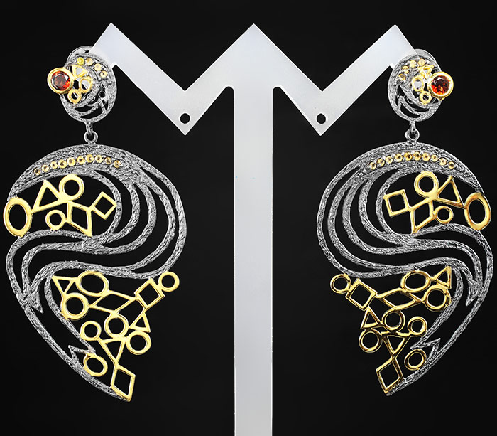 Серьги из черненого стерлингового серебра 925 пробы с гранатами и цитринами. Вес — 14,9 гр. Размер серег — 73×37 мм. Выборочное золочение.