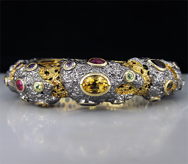 Браслет из серебра 925 пробы с цитринами.Серебро 925, Золочение, Чернение Инкрустация: Аметист, Гранат, Перидот, Рубин, Цитрин Вес изделия: 54,1 грамм Размер: 80×17 мм