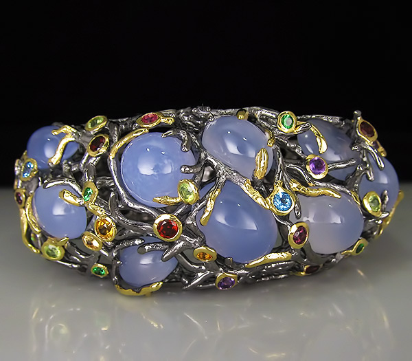Браслет из черненого стерлингового серебра 925 пробы с халцедоном, аметистами, гранатами, перидотами, топазами, цаворит гранатами и цитринами. Вес — 86,9 гр. Площадка браслета — 74×31 мм. Выборочное золочение.