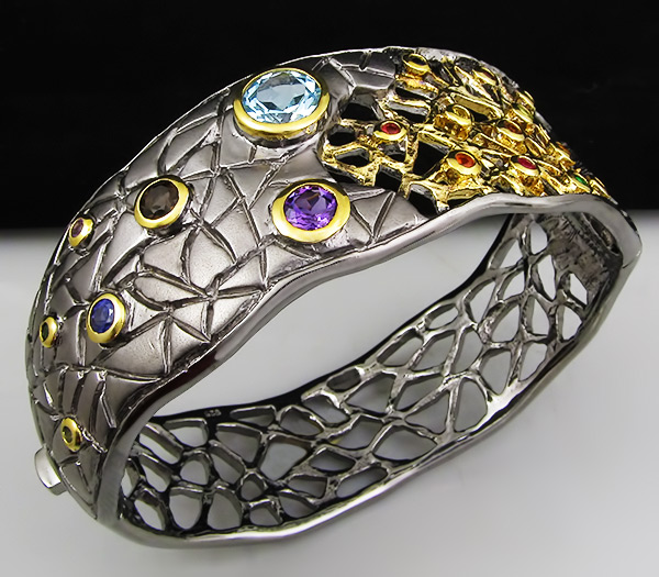 Браслет из черненого стерлингового серебра 925 пробы с аметистами, топазами, дымчатым кварцем, перидотами, разноцветными сапфирами, цаворитами, родолитами и мозамбкскими гранатами. Вес браслета — 60,5 гр. Площадка браслета — 73×28 мм. Выборочное золочение и матирование.