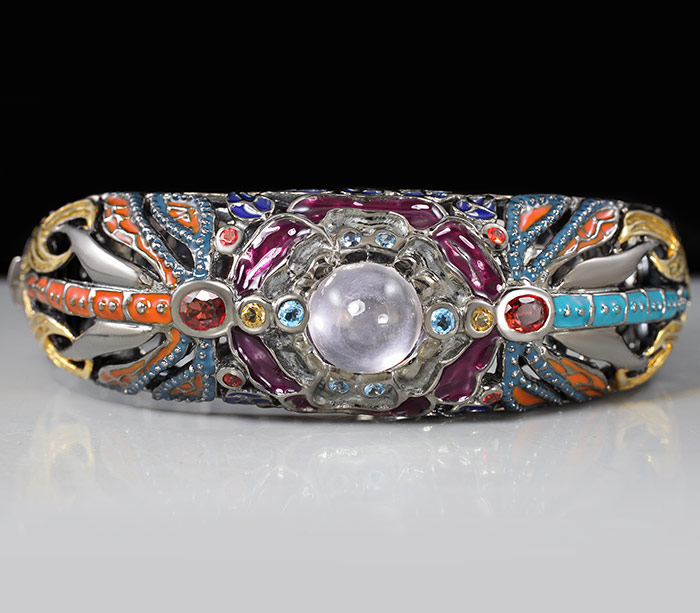 Браслет из черненого стерлингового серебра 925 пробы с розовым кварцем, топазами, цитринами и сапфирами. Вес браслета — 64 гр. Площадка браслета — 76×23 мм. Выборочное золочение и покрытие эмалью.