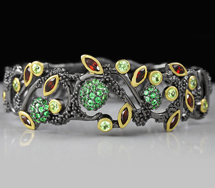 Браслет из черненого стерлингового серебра 925 пробы с перидотами, цаворитами и мозамбикскими гранатами. Вес браслета — 34,2 гр. Площадка браслета — 70×22 мм. Выборочное золочение.
