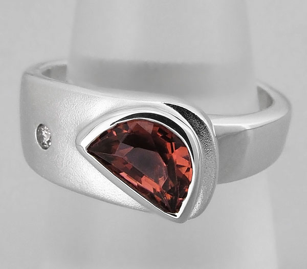 Кольцо из родированного стерлингового серебра 925 пробы с розовым турмалином и бриллиантом. Выборочное матирование. Размеры вставок 2 мм и 7×4 мм. Ширина площадки 8 мм, высота 7 мм. Вес изделия 8,9 гр. Размер 18,25.