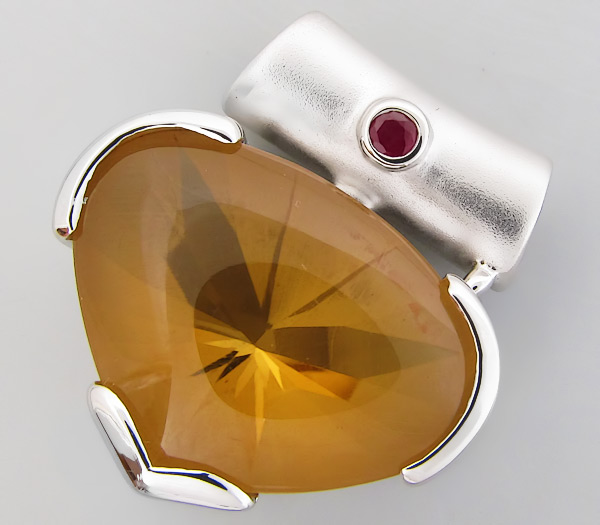 Кулон из стерлингового серебра 925 пробы с цитрином авторской огранки и сапфиром. Изделие частично матировано. Размеры вставок 2 мм и 21 х 16 мм. Площадка кулона 28 х 25 мм. Вес 18,9 г.