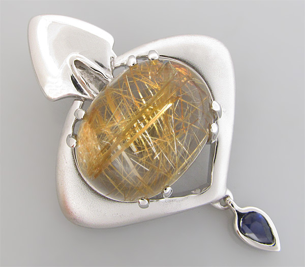 Кулон из стерлингового серебра 925 пробы с кабошоном рутилового кварца и синим сапфиром. Изделие частично матировано. Размеры вставок 6 х 3 мм и 20 х 15 мм. Площадка кулона 50 х 34 мм. Вес 23,4 г.