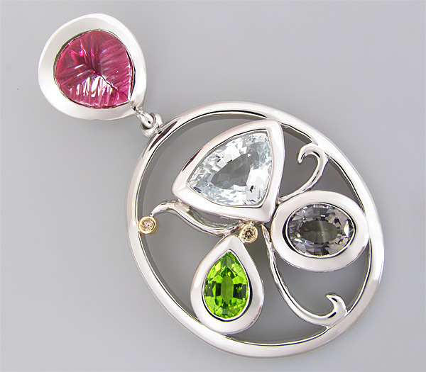 Кулон из стерлингового серебра 925 пробы с резным пурпурным турмалином, голубым аквамарином, желтовато-зеленым перидотом, дымчатым турмалином и бриллиантами. Размеры вставок от 8 х 6 мм до 11 х 11 мм. Размеры кулона с петлей 60 х 34 мм. Вес 24,5 г.