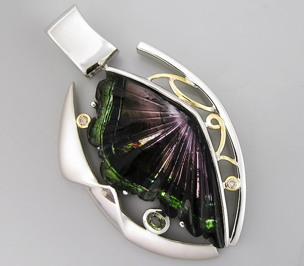 Кулон из родированного стерлингового серебра 925 пробы с резным полихромным турмалином огранки "крыло бабочки", зеленым сапфиром и 2 бриллиантами. Выборочное матирование. Оправа бриллиантов и декоративные элементы выполнены из золота 750 пробы. Размеры вставок от 2 мм до 42×21 мм. Размеры кулона с петлей 59×35 мм. Вес 25,6 гр.