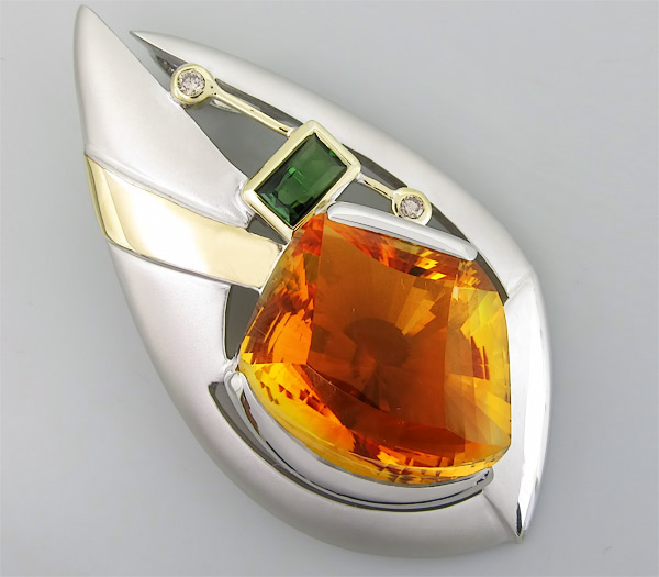 Кулон из родированного стерлингового серебра 925 пробы с крупным цитрином авторской огранки, зеленым турмалином и 2 бриллиантами. Выборочное матирование. Оправа бриллиантов и декоративные элементы выполнены из золота 750 пробы. Размеры вставок от 2 мм до 23×17 мм. Площадка кулона 59×32 мм. Вес 37,4 гр.