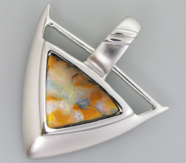 Кулон из родированного стерлингового серебра 925 пробы с болдер опалом. Выборочное матирование. Основные цвета опалесценции опала: розовый/синий. Размер центральной вставки — 15×11 мм. Площадка кулона 31×28 мм. Вес 8,6 гр.