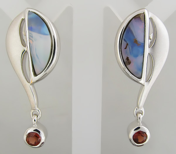 Серьги из стерлингового серебра 925 пробы с автралийскими болдер опалами и гранатами. Изделие частично матировано. Размеры вставок от 4 мм до 15 х 5 мм. Площадка серег 35 х 14 мм. Вес пары 12,6 г.