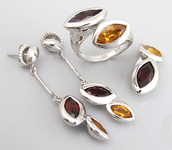 Комплект (кольцо + серьги + кулон) из родированного стерлингового серебра 925 пробы с золотистыми цитринами и мозамбикскими гранатами. Размеры вставок от 7×3 мм до 12×5 мм. Вес комплекта 26 гр.