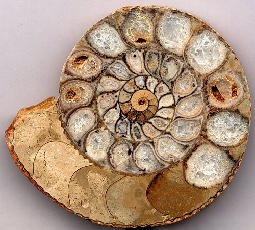 Аммонит    Аммониты, или Аммоноидеи (лат. Ammonoidea) — вымерший подкласс головоногих моллюсков со спирально закрученными (как правило) раковинами, разделенными на отдельные камеры. Близкие родственники наутилусов. Возникли в девонском периоде Палеозоя, вымерли в конце мелового периода (Мезозой). Свое название аммониты получили в честь древнеегипетского божества Амона, изображающегося обычно со спиральными рогами.