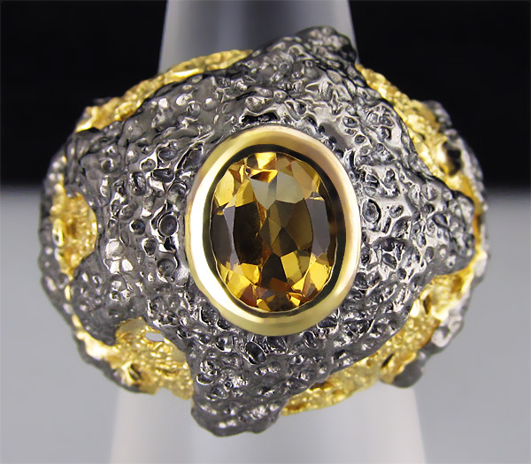 Кольцо из черненого стерлингового серебра 925 пробы с цитрином. Выборочное золочение. Площадка кольца — 27×22 мм. Вес — 16,0 гр.