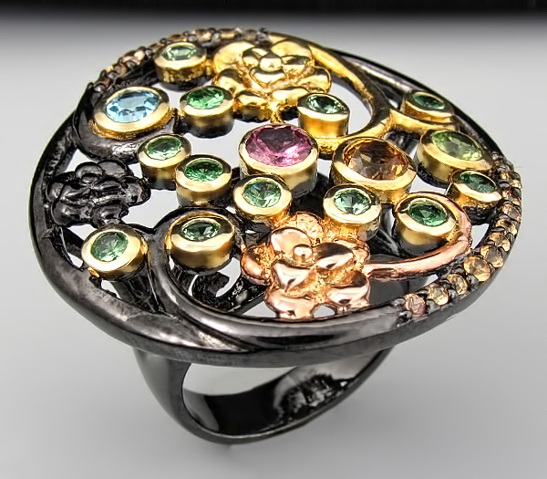 Кольцо из черненого стерлингового серебра 925 пробы с турмалином, цитрином, топазом, цаворитами гранатами и сапфирами. Выборочное золочение. Вес — 14,4 гр. Размер площадки — 32×32 мм.