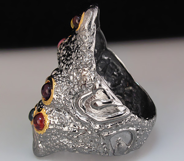 Кольцо из черненого стерлингового серебра 925 пробы с кабошонами опала, топаза, турмалина, сапфира и аметиста. Вес — 15,6 гр. Размер — 34×22 мм. Выборочное золочение.