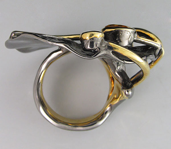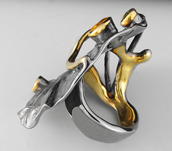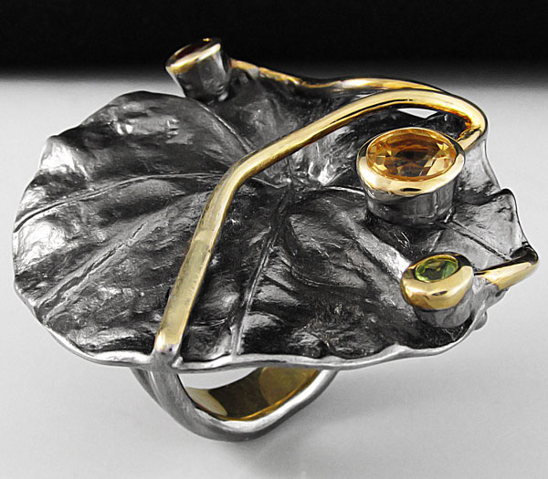 Кольцо из черненого стерлингового серебра 925 пробы с цитрином, гранатом и перидотом. Вес кольца — 27,5 гр. Площадка кольца — 43×41 мм. Выборочное золочение и матирование.