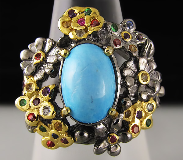Кольцо из черненого стерлингового серебра 925 пробы с бирюзой, сапфирами, аметистами, цаворитами и родолитами гранатами. Вес кольца — 10,4 гр. Площадка кольца — 23×23 мм. Выборочное золочение.В наличии кольцо размером: 18.5