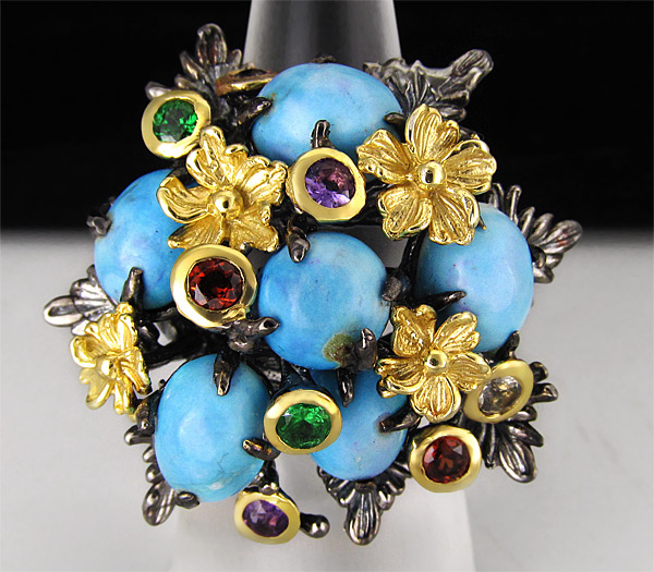 Кольцо из черненого стерлингового серебра 925 пробы с бирюзой, аметистами, сапфирами, цаворитами и мозамбикскими гранатами. Вес кольца — 22,4 гр. Площадка кольца — 36×36 мм. Выборочное золочение.