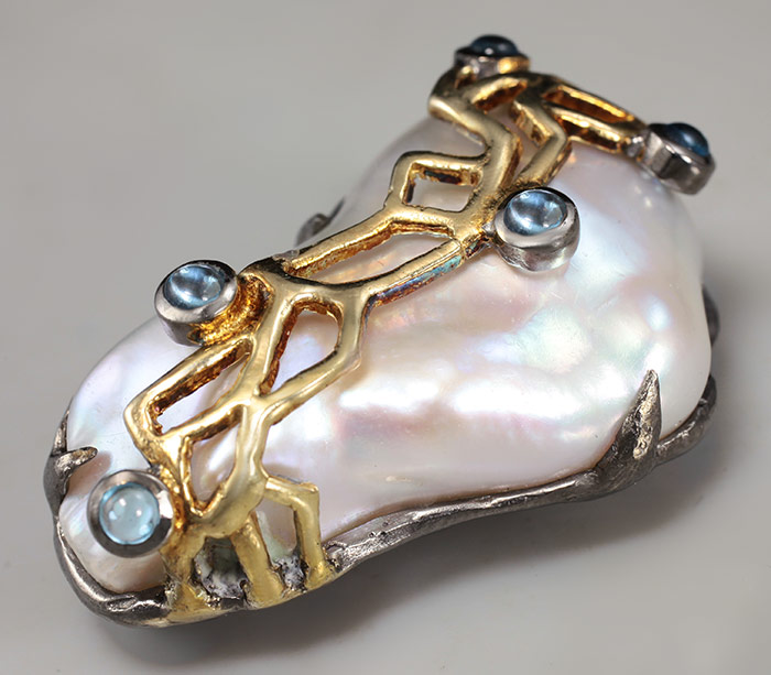 Кулон из черненого стерлингового серебра 925 пробы с жемчугом барокко и топазами. Вес — 14,2 гр. Размер кулона — 33×22 мм. Выборочное золочение