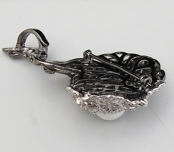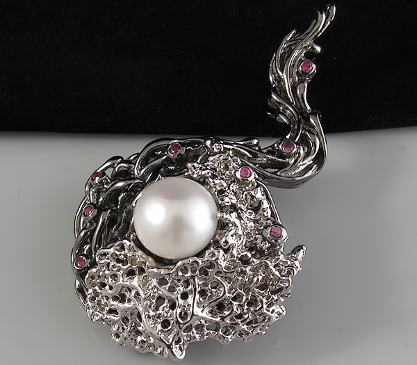 Брошь/кулон из родированного и черненого стерлингового серебра 925 пробы с жемчужиной (13мм) и розовыми сапфирами. Вес — 34,67 гр. Размер броши — 68×39 мм.