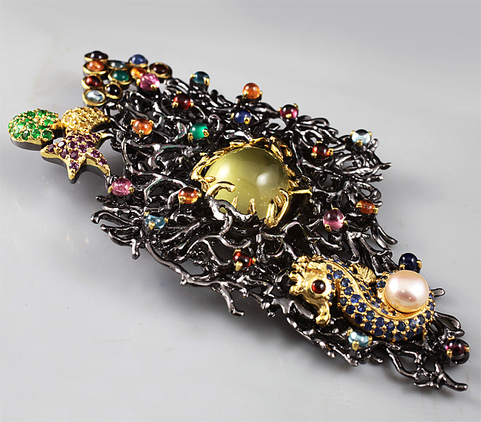 Серебро 925, Золочение, ЧернениеИнкрустация: Аметист, Гранат, Жемчуг, Сапфир, Турмалин, Цаворит гранат, ЦитринВес изделия: 46,2 граммРазмер: 95×53 мм