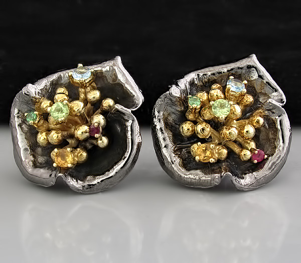 Серьги из черненого стерлингового серебра 925 пробы с топазами, цаворитами, перидотами, цитринами и рубинами. Вес — 16,1 гр. Размер серег — 27×26 мм. Выборочное золочение.