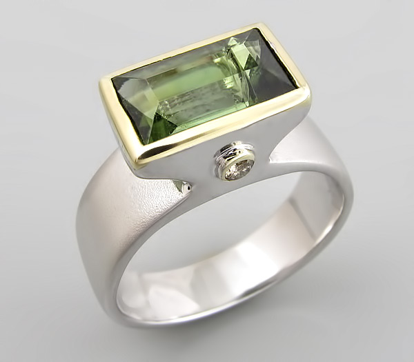Кольцо из родированного стерлингового серебра 925 пробы с зеленым турмалином и 2 бриллиантами. Выборочное матирование. Оправа бриллиантов и декоративные элементы выполнены из золота 750 пробы. Размеры вставок 2 мм и 10×6 мм. Площадка 12×9 мм, высота 8 мм. Вес изделия 5,9 гр. Размер 17,25.