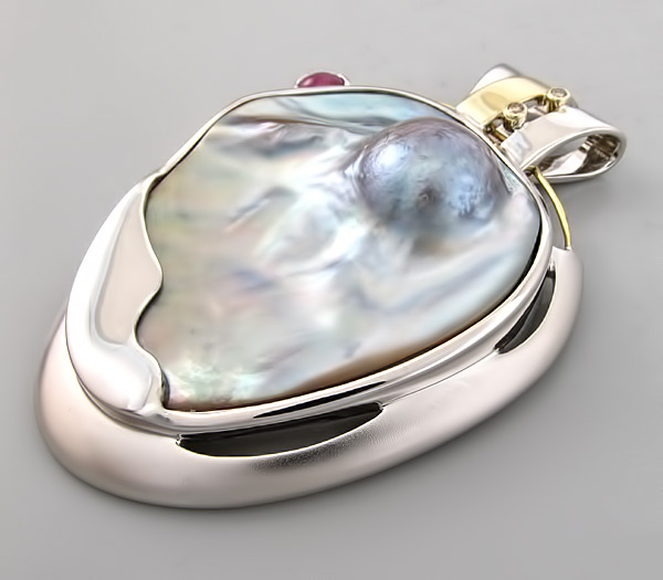 Кулон из стерлингового серебра 925 пробы с пузырчатым жемугом, кабошоном пурпурного сапфира и 2 брилллиантами. Изделие частично матировано. Оправа бриллиантов и декоративные элементы выполнены из золота 750 пробы. Размеры вставок от 2 мм до 42 х 33 мм. Площадка кулона 74 х 48 мм. Вес 47,4 г.