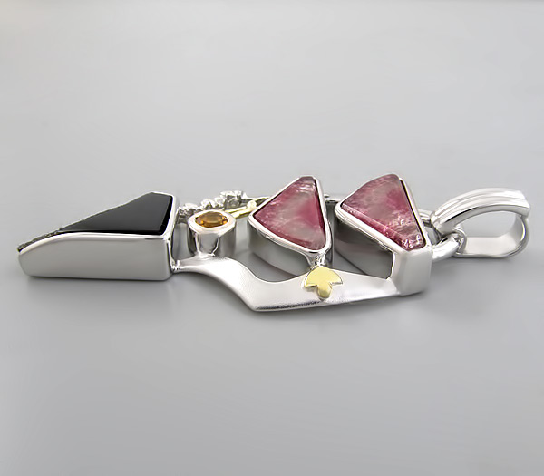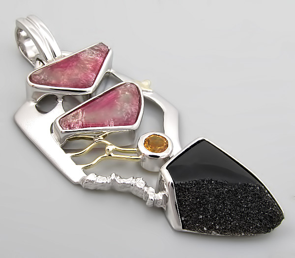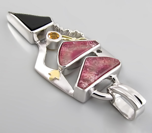 Кулон из родированного стерлингового серебра 925 пробы с друзой оникса, розовыми турмалинами и золотистым цитрином. Выборочное матирование. Декоративные элементы выполнены из золота 750 пробы. Размеры вставок от 4 мм до 20×15 мм. Размеры кулона с петлей 70×29 мм. Вес 21,5 гр.