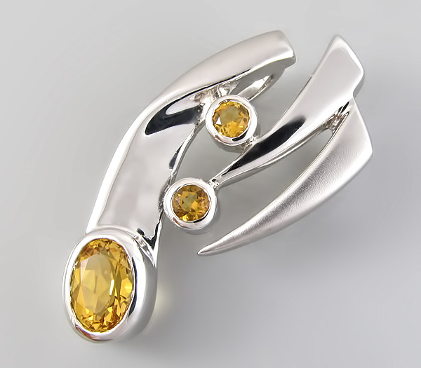 Кулон из родированного стерлингового серебра 925 пробы с золотистыми цитринами. Выборочное матирование. Размеры вставок 3 мм и 7×5 мм. Размеры кулона с петлей 31×15 мм. Вес 6,3 гр.