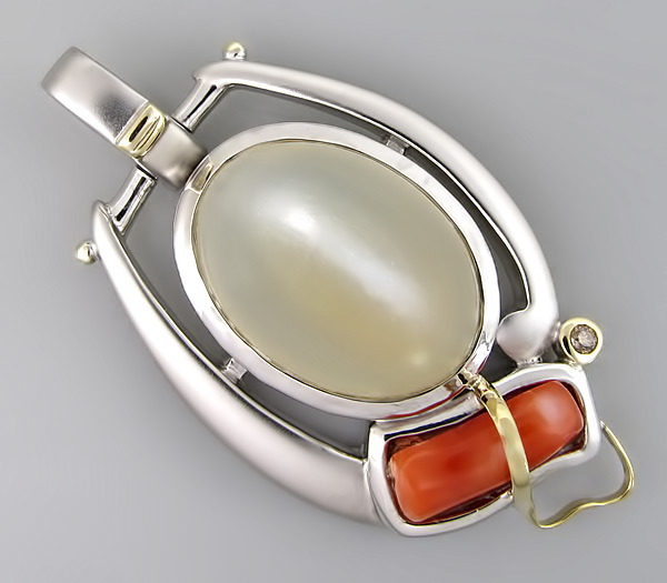 Кулон из родированного стерлингового серебра 925 пробы с лунным камнем, кораллом и бриллиантом. Выборочное матирование. Оправа бриллианта и декоративные элементы выполнены из золота 750 пробы. Размеры вставок от 2 мм до 22×16 мм. Размеры кулона с петлей 53×29 мм. Вес 24,1 гр.