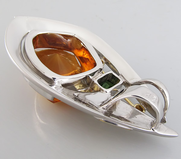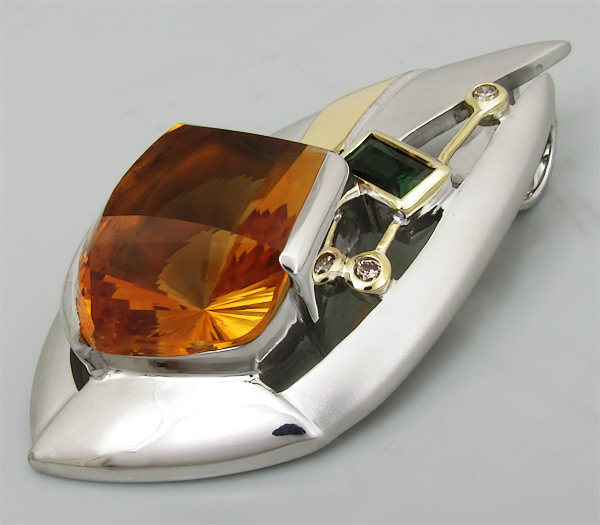 Кулон из родированного стерлингового серебра 925 пробы с крупным цитрином авторской огранки, зеленым турмалином и 2 бриллиантами. Выборочное матирование. Оправа бриллиантов и декоративные элементы выполнены из золота 750 пробы. Размеры вставок от 2 мм до 23×17 мм. Площадка кулона 59×32 мм. Вес 37,4 гр.