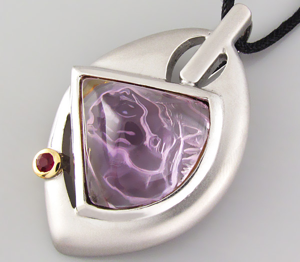 Вашему вниманию предлагается стильный кулон из стерлингового серебра (925 проба) с аметистом авторской огранки и пурпурным сапфиром! Оправа сапфира выполнена из золота 585 пробы. На тыльной поверхности аметиста вырезана голова лошади. Площадка кулона 42 х 27 мм. Вес 18,8 г. Ниже приводятся размеры вставок.