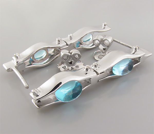 Вашему вниманию предлагаются экстравагантные серьги из стерлингового серебра (925 проба) с кабошонами светло-голубых топазов! Размеры вставок 7 х 5 мм. Площадка серег 41 х 8 мм. Вес пары 13,3 г.