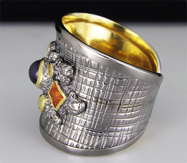 Кольцо из черненого стерлингового серебра 925 пробы с аметистом (кабошон 5 мм) и самоцветами. Выборочное золочение. Вес — 13,3 гр. Площадка — 24×22 мм.