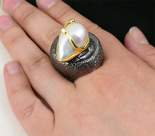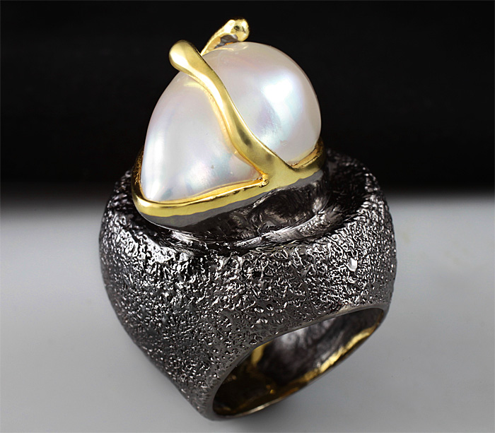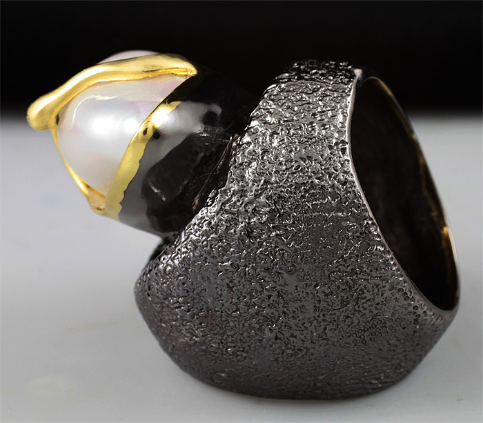 Кольцо из черненого стерлингового серебра 925 пробы с фантазийной жемчужиной. Выборочное золочение. Вес — 33,6 гр. Площадка кольца — 31×29 мм.