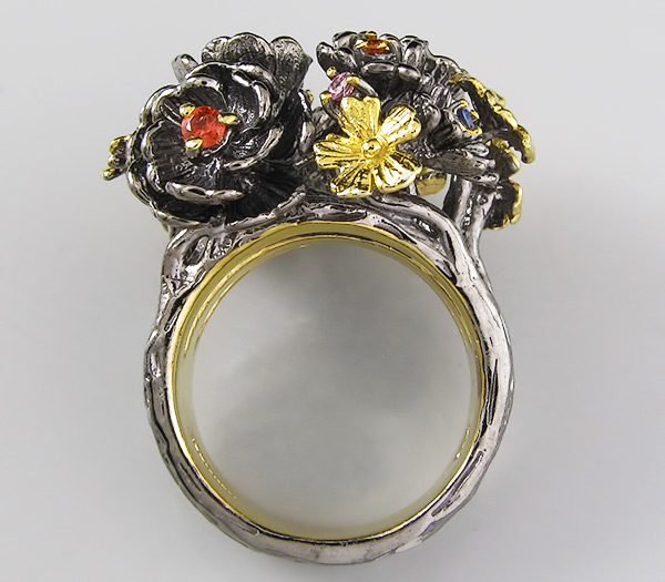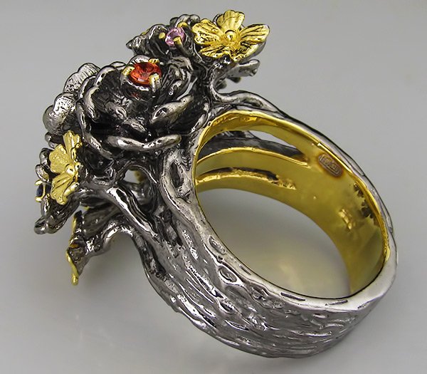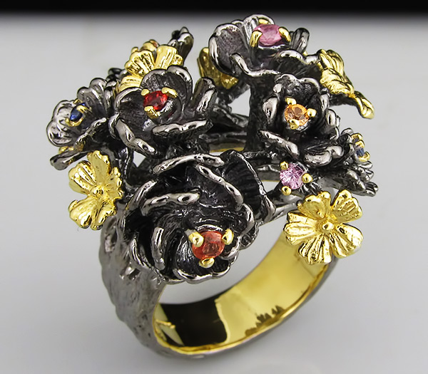 Кольцо из черненого стерлингового серебра 925 пробы с разноцветными сапфирами. Выборочное золочение. Вес — 18,6 гр. Площадка кольца — 30×27 мм.