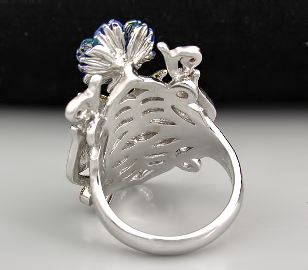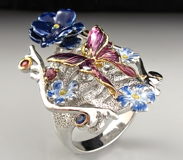 Кольцо из стерлингового родированного серебра 925 пробы с сапфирами, турмалинами и покрытием эмалью. Выборочное золочение. Вес — 14,1 гр. Размер площадки — 35×24 мм.