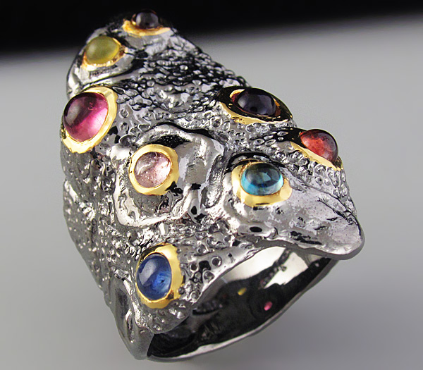 Кольцо из черненого стерлингового серебра 925 пробы с кабошонами опала, топаза, турмалина, сапфира и аметиста. Вес — 15,6 гр. Размер — 34×22 мм. Выборочное золочение.