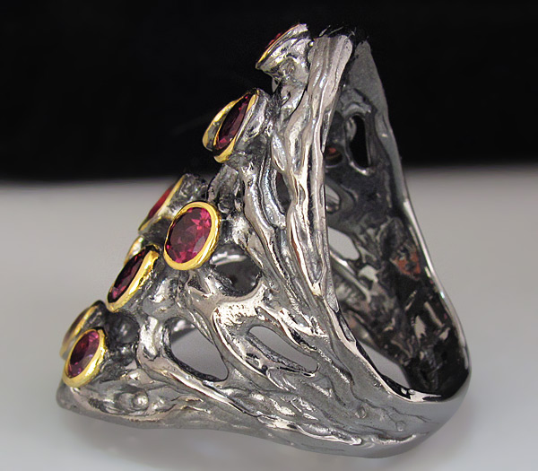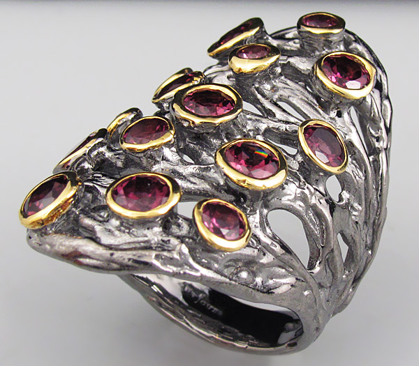 Кольцо из родированного стерлингового серебра 925 пробы с родолитами (3–5 мм). Вес —15,7 гр. Размер площадки — 35×21 мм. Выборочное золочение.