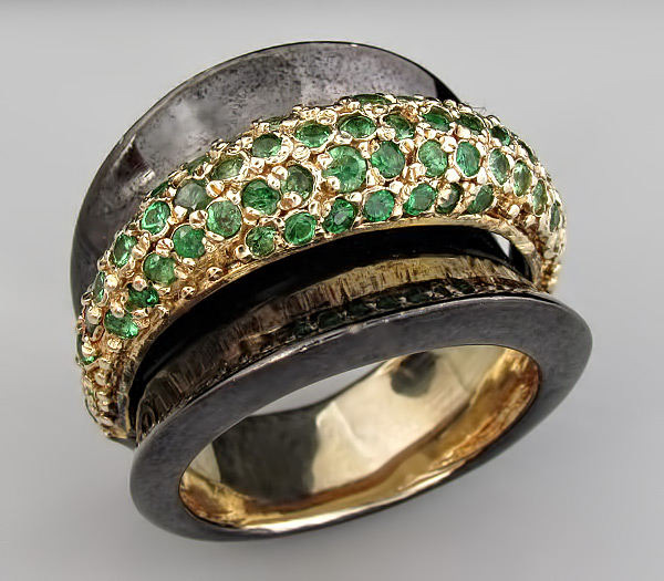 Кольцо из черненого стерлингового серебра 925 пробы с цаворитами гранатами. Вес — 14,4 гр. Площадка кольца — 26×25 мм. Выборочное золочение.