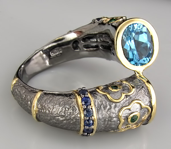 Серебро 925, Золочение, ЧернениеИнкрустация: Аметист, Сапфир, Топаз, Цаворит гранатВес изделия: 11,6 граммРазмер: 17