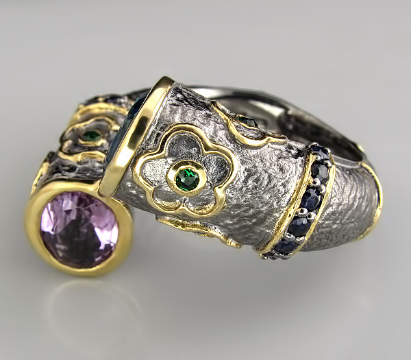 Кольцо из матированного черненого стерлингового серебра 925 пробы с аметистом, топазом, синими сапфирами и цаворитами гранатами. Вес — 11,6 гр. Площадка кольца — 20×28 мм. Выборочное золочение.