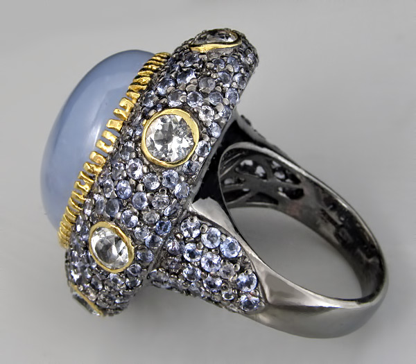 Кольцо из черненого стерлингового серебра 925 пробы с халцедоном кабошоном (20×17 мм), бесцветными цирконами и танзанитами. Вес кольца — 18 гр. Площадка кольца — 32×28 мм. Выборочное золочение.